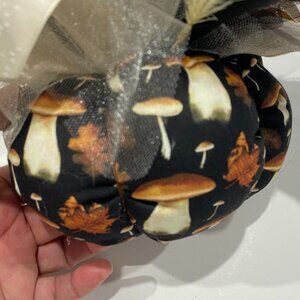 Handmade "Mushrooms in The Wild", in black, brown, and ivory pumpkin with ribbons, tulle, and feather accents . Each pumpkin is unique and filled with fiberfill. Real stem. Approximate size is 6.5" x 6.5". WW 650