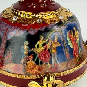 Crafted from heirloom porcelain with lavish gold-toned accents, sparkling rhinestone embellishments, and detailed ballet scenes, it is a showpiece for collectors and ballet lovers alike. Featuring a numbered base for authenticity, this is a highly sought-after holiday treasure that beautifully marries Russian ballet artistry with functional elegance. The ballerina does not turn, but the music plays flawlessly—an enchanting display item and gift for Nutcracker and music box enthusiasts.
