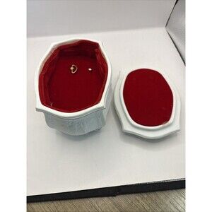 The Music Box Lenox Nativity Away in A Manger with a Red Velvet Interior is a large, rectangular porcelain collectible featuring an all-over pattern and a white color scheme. Manufactured in 1992 in Japan, this vintage piece is part of the Lenox franchise and is designed as a complete Nativity scene. The musical features of this item are highlighted by its intricate design, making it a perfect addition to any adult's holiday decor collection.