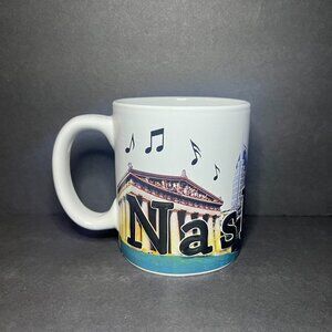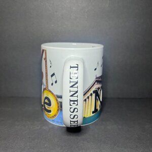 Selling a Music City Nashville Tennessee Large 16oz Souvenir Mug. It measures 4.5" (h) x 3.75" (w), and features a guitar and banjo aside images of the Parthenon Art Museum, John Seigenthaler bridge, and the Nashville Skyline. It has some wear on the inside (shown in the pictures), but it's in otherwise good condition!