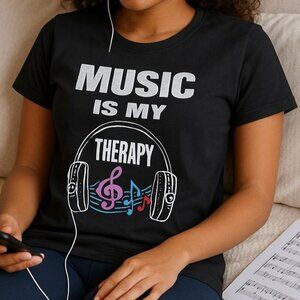 Celebrate your love for sound with this “Music Is My Therapy” T-shirt — a must-have for musicians, singers, and anyone who finds peace through melody. The design features bold white lettering with a colorful treble clef and music notes framed by headphones, creating the perfect graphic for concerts, rehearsals, or everyday wear. Made of 100% cotton for breathable comfort.