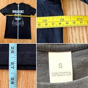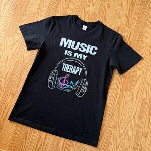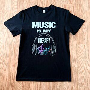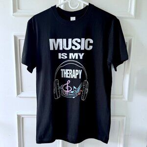 Music Is My Therapy T Shirt Size S Black Graphic Tee Headphones Treble Clef Note