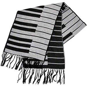 Add some musical flair to your outfit with this scarf. The scarf features piano keyboard and is made from knit acrylic material with fringe accents. Measuring 12" x 72", this unisex scarf can be worn as a neck warmer during the cooler fall and winter seasons. This scarf is perfect for any music lover and adds a touch of style to any outfit