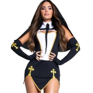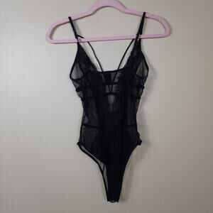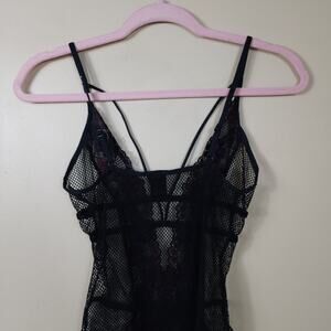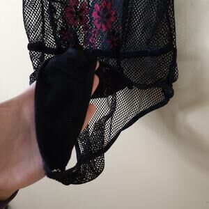 Gently used. Fishnet teddy with front flower details. Black and red.