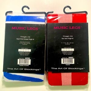 Vibrant thigh high socks by Music Legs. Features heart print and two-tone designs. Perfect for a bold look. Pack of two