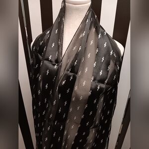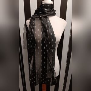 long rectangle black scarf with all over music note design. alternating sheer and opaque stripes. 100% polyester. very pretty and in excellent condition