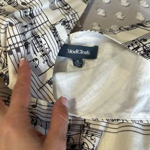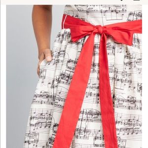 Music 🎶 🎼 notes dress from ModCloth sold out black and ivory with red belt. Has pockets! Brand New with out tag