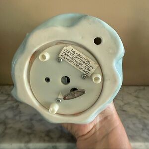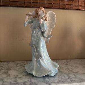 Delightful angel figurine playing a violin. Features a graceful light blue gown and white wings. This is a music box with wind up on the bottom. Plays The First Noel. No chips, excellent condition. 10” tall.