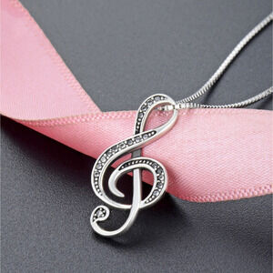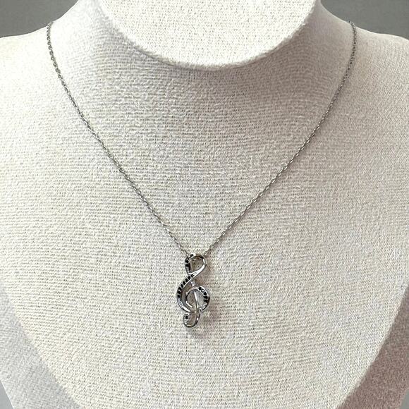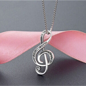 Experience the perfect addition to any outfit with our stunning Musical Note Silver Necklace. Made with elegant silver and adorned with glistening black crystals, this necklace features an adjustable 16-inch length and 1 1/2-inch extender, complete with a 1-inch pendant. Give it as a thoughtful gift or treat yourself to the beauty and charm of this necklace. Available at a discounted price now!