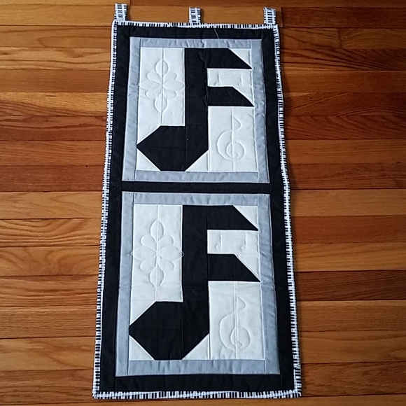 Music note wall hanging. Great for any room or music studio. Its done in black, white and gray. 100% cotton. Machine wash cold water.
