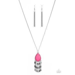 A vivacious pink stone teardrop pendant swings from the bottom of a lengthened silver chain. Tassels of silver teardrop frames trickle from the bottom of the colorful pendant, creating a musical fringe. Features an adjustable clasp closure.