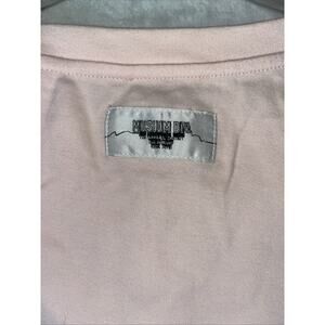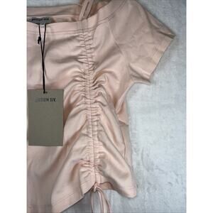 New with tags- The Musium DIV Museum Div. Women pale Pink Short Sleeve crop top is a stylish and feminine top featuring an embroidered logo. Made from comfortable cotton material, this Italian Italy designed shirt has a mock neck with a tie closure, giving it a unique and trendy look. The strappy sleeves and medium size make it a versatile piece that can be dressed up or down.