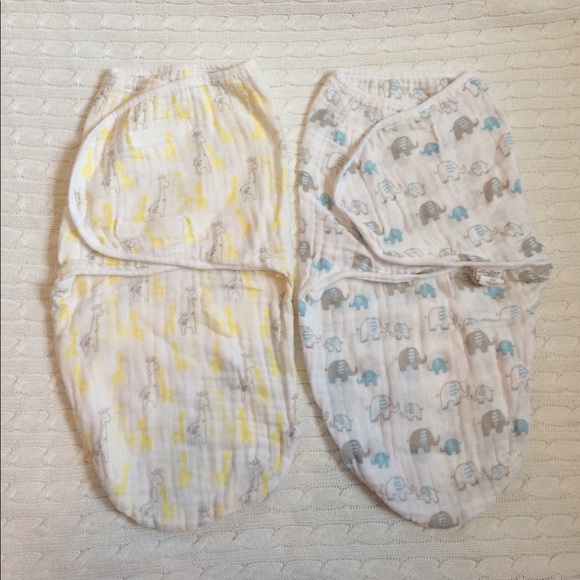 Two double-layered Muslin sleep sacks. Wrap closure with Velcro to keep baby swaddled tight. Excellent condition. No stains, tears, holes, or pilling.