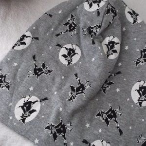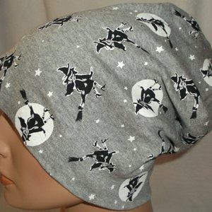 New Handmade Unisex Hat - constructed in a one-piece design so you can wear as a standard slouch hat or a fold brim hat. Unisex one size fits most sizing. Made with a nice cotton blend fabric with a gray background and witch print.