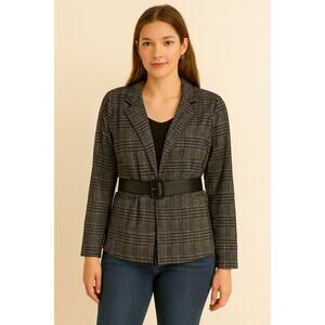 Sophisticated women’s blazer from Must Have, featuring a classic plaid Glen check pattern in black and gray tones. Designed with a structured silhouette, notched lapel, and a sleek belted waist, the belt is not included. I styled it with multiple belts so you can see the versatility. A versatile piece that transitions easily from professional wear to casual chic.