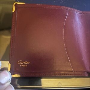 Enhance your essentials with this authentic Must de Cartier bifold wallet, meticulously crafted from deep Bordeaux leather and distinguished by signature gold-tone corner accents. An ideal choice for individuals who appreciate luxury combined with practicality, this wallet includes the original authenticity card.