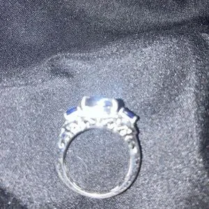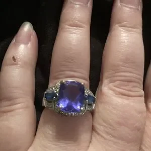 Gorgeous square color changing Fluorite center stone (Cush 4.60 cts )with Lab created blue sapphires on each side as in Platinum over sterling silver .925
