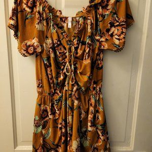 Mustard colored floral romper, flattering fit and elastic waist and neck line, can be worn off the shoulders.