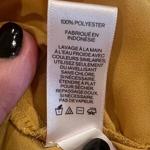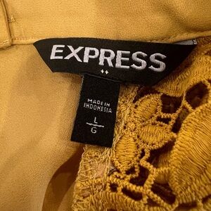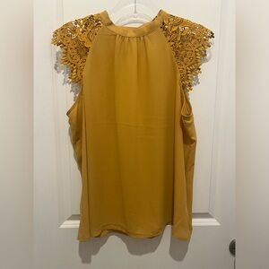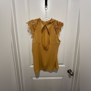 This mustard top features intricate lace sleeves and an open back. It is ideal for both casual and formal occasions.