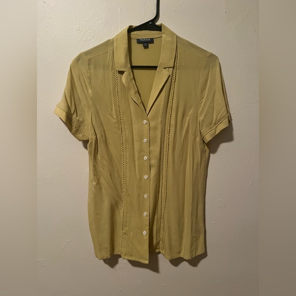 Adorable golden mustard button down shirt. Collared. Delicate detailing down sides of placket match the detailing on the short shirt sleeves. Pit to pit measures approximately 18”. Shoulder to bottom hem measures approximately 24”. Please reach out with any questions!