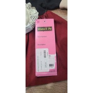 New with tags, adorable Mustard Pie 12 months dress. Black top with dark red/maroon gathered skirt. Long sleeves with cream cuffs that match cream bow. Comes with matching clip-on piece. Overall length is about 14.5" top portion is cotton spandex, skirt is a linen. Please see images for details, and feel free to ask questions. Thanks!