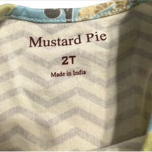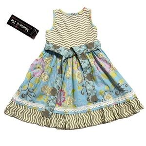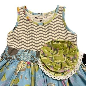 Adorable Mustard Pie dress with chevron top and floral skirt. Features blue and pink tones. Ideal for casual outings.