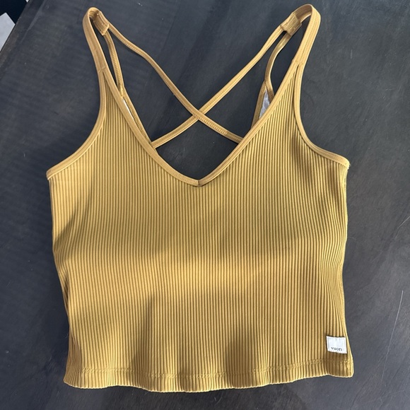 Stylish mustard ribbed camisole from Garage. Features a flattering V-neck and crisscross straps. Ideal for layering or wearing alone.