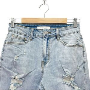 Trendy Mustard Seed distressed Bermuda shorts in light wash denim. Features a mid-rise fit, classic five-pocket style, raw frayed hem, and heavy distressing on the front and back for a laid-back, edgy look. Perfect for summer, festivals, or casual everyday wear.