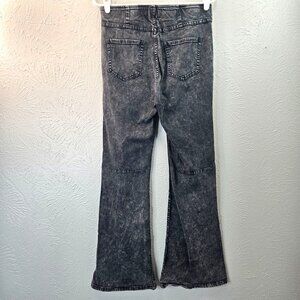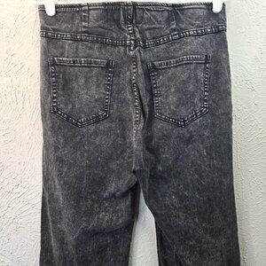 Faded acid wash black color. Flared style. Regular fit. High rise. Bare back, no pocket. Pull on style.