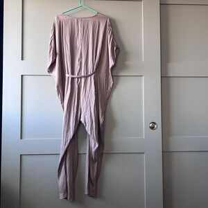 Design details: V-neckline with fabric-covered button front placket, wide dolman sleeves, removable self-tie belt at waist, tapered legs, and draped drop-crotch fit.