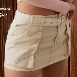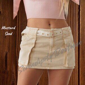 Mustard Seed Kahki Tan Denim Pre-Washed Belted Jean Mini Skirt