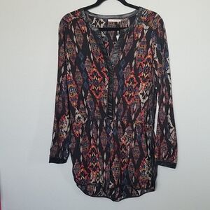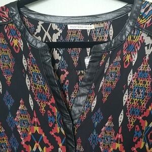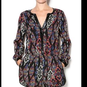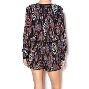 Long sleeve romper. So much trim! Theres some at the neck, down the chest, shoulders, down the sides, lining the leg opening, at the cuffs. Button closure down chest, hidden by panel. Has a geomtric / tribal like pattern. Summer, spring, fall, mobwife, earthtones, flirty, girly, elevate, vegas, dance, club, rave, vacation , resort, date night, statement, print, pattern, southwest, ikat, moto, bikercore,edgy, sleek, polished