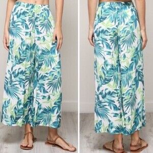 Mustard Seed Tropical Foliage High Waist Straight Leg Pull On Summer Beach Pants