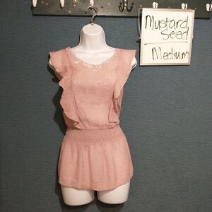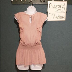 Mustard Seed, pale pink, sleeveless, ruffled, bohemian and eclectic, loose fit top with a keyhole closure in the back and elastic around the waistline. In excellent new condition. Size medium