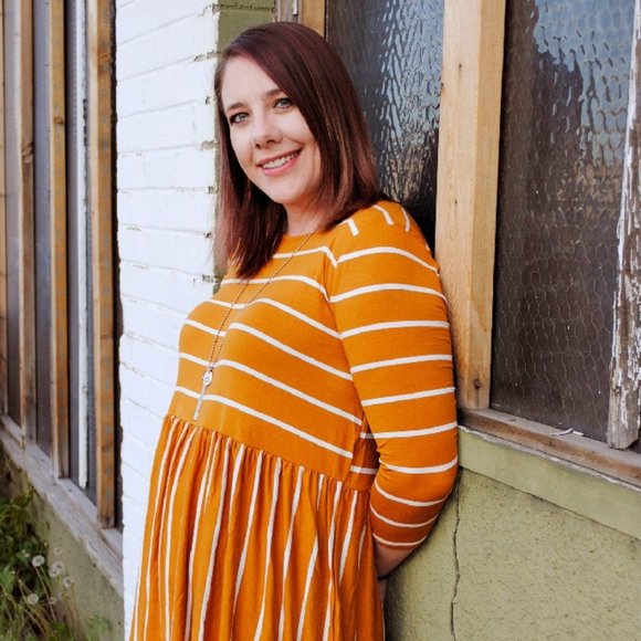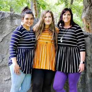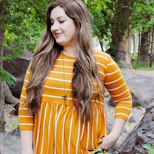 This long, mustard-colored, striped shirt is super comfortable and includes a fun ruffle on the bottom. It's one of those shirts that pairs with just about anything, jeans, leggings, or even shorts.