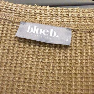 Chic waffle knit design. Mustard hue. Button-up front. Perfect for layering.