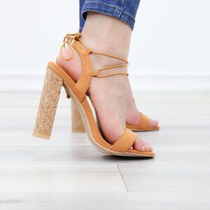 Mustard Wrap Sandals Cork Heel Adjustable Straps Open Toe