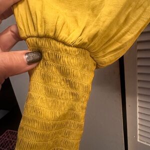 Flowy boho blouse in a rich mustard yellow. Features a V-neckline and gathered details. Perfect for casual outings.