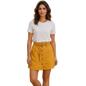 This mustard yellow mini skirt by Hesperus combines style and comfort, featuring a belted waist and practical front pockets. Perfect for casual wear, it is crafted from breathable 100% cotton for everyday ease.