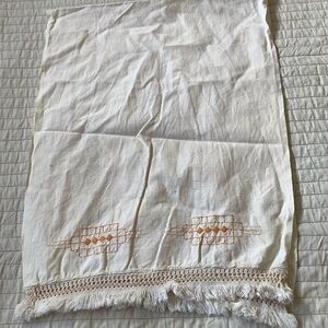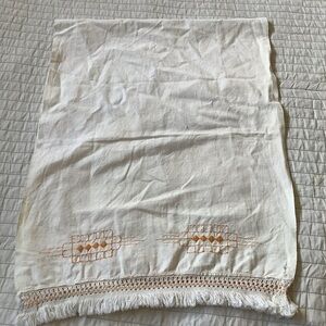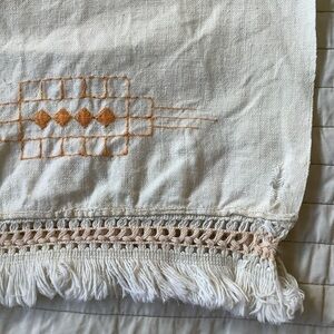 Sort of has an Aztec design in the ever popular mustard yellow embroidered on a cream linen. Has a small hole, this was more than likely handmade in the 50’s.