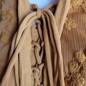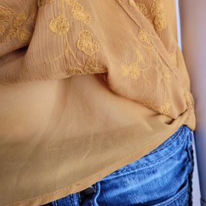 The perfect summer top, light and flowy. EUC no tears, stains or ripped fabric or seams. Front is lined with sheer-like flower overlay. Lightweight top. Color is a mustard yellow. Size is 0, but does not have a tight fit.