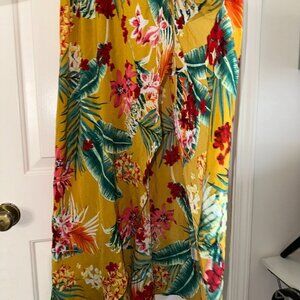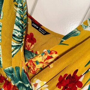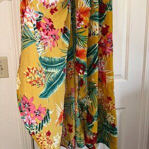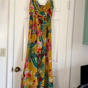 Mustard Yellow Palm Leaf Floral Maxi Dress Spaghetti Strap Front Slit XS