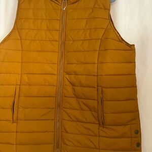Stylish mustard yellow puffer vest with zip closure and side pockets. Perfect for layering.