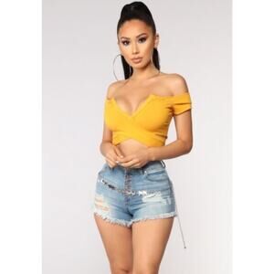 Mustard Yellow Take It Or Leave It Off Shoulder Crop Snap Button Ribbed Top XS