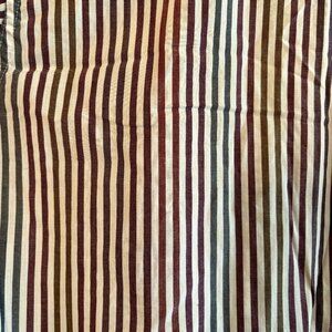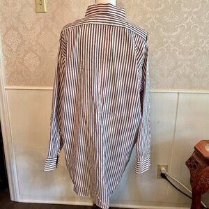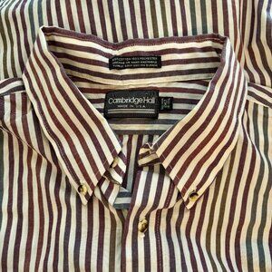This here is a true classic long sleeve button down. Featuring equally sized vertical stripes in muted jewel tones and white, it would look great with a pair of khakis or even some jeans for casual Friday!