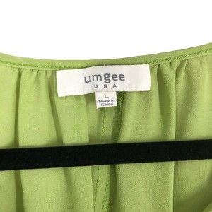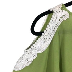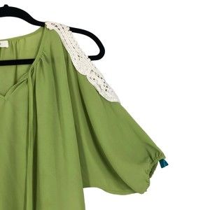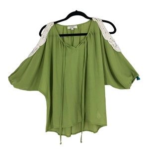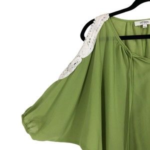 Muted Green Sheer Cold Shoulder Top w/Crocheted Shoulders, Tie Throat SZ L Umgee