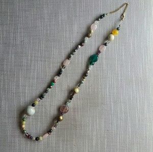 Multi colored gem stones on a gold lobster clasp. Roughly 30" long. Hangs 15".