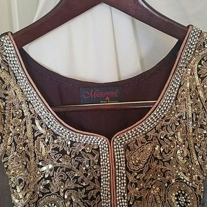 Custom craft handmade gold embroidery on chiffon with silk lining and straight silk pants and a chiffon scarf
