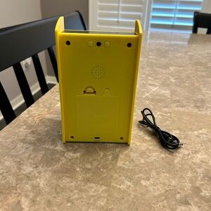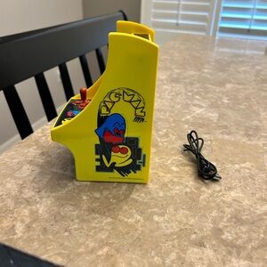 Compact Pac-Man console. Features classic joystick and buttons for retro gaming. Runs on batteries or plug-in.