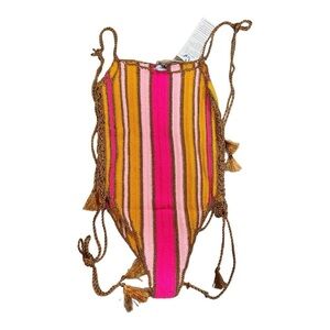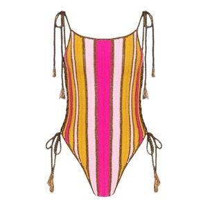 Allover vertical striped design. Adjustable lace up sides with cutout detailing. Gold braided shoulder & hip ties with tassel accents. High leg silhouette & cheeky coverage.